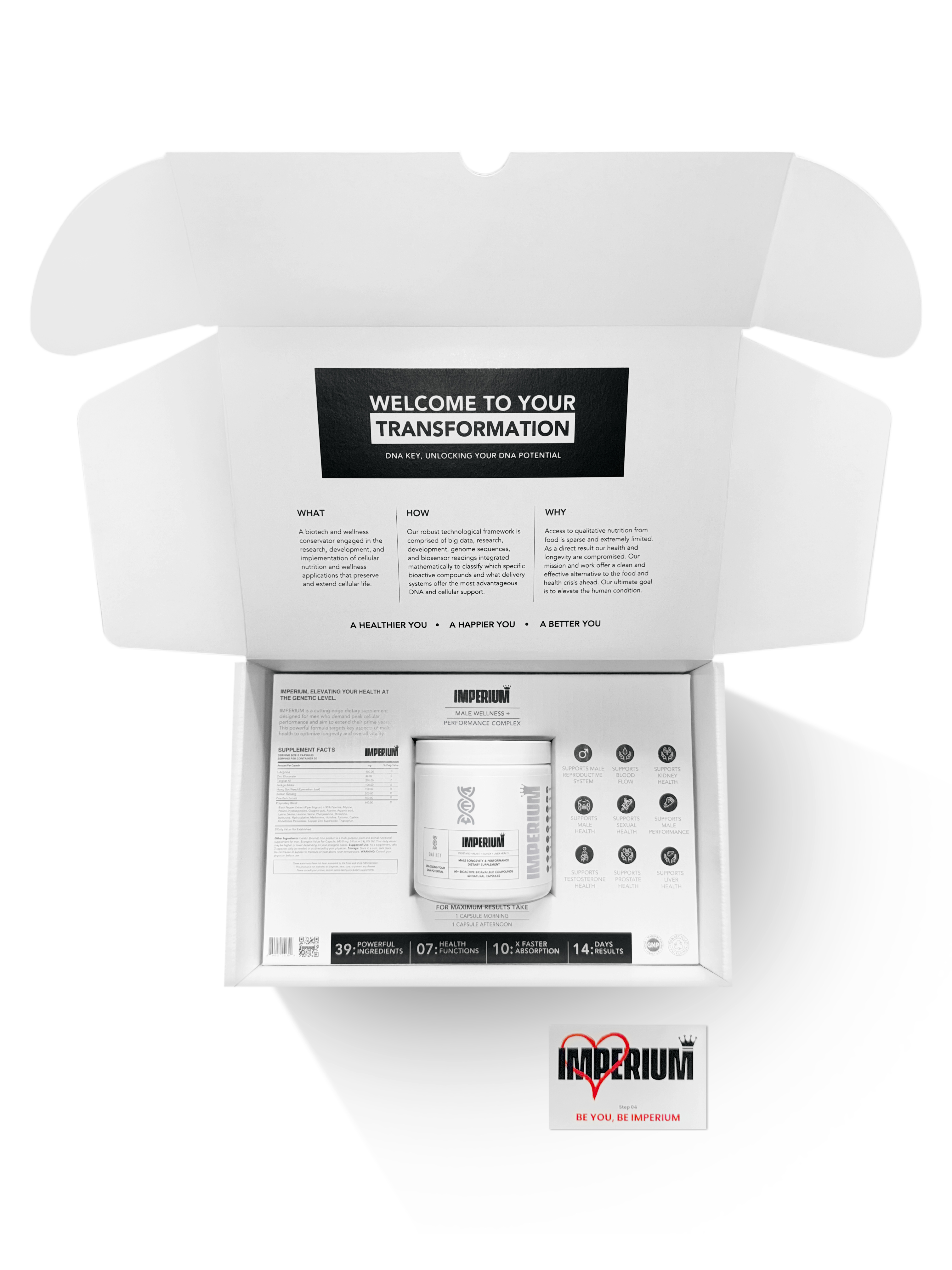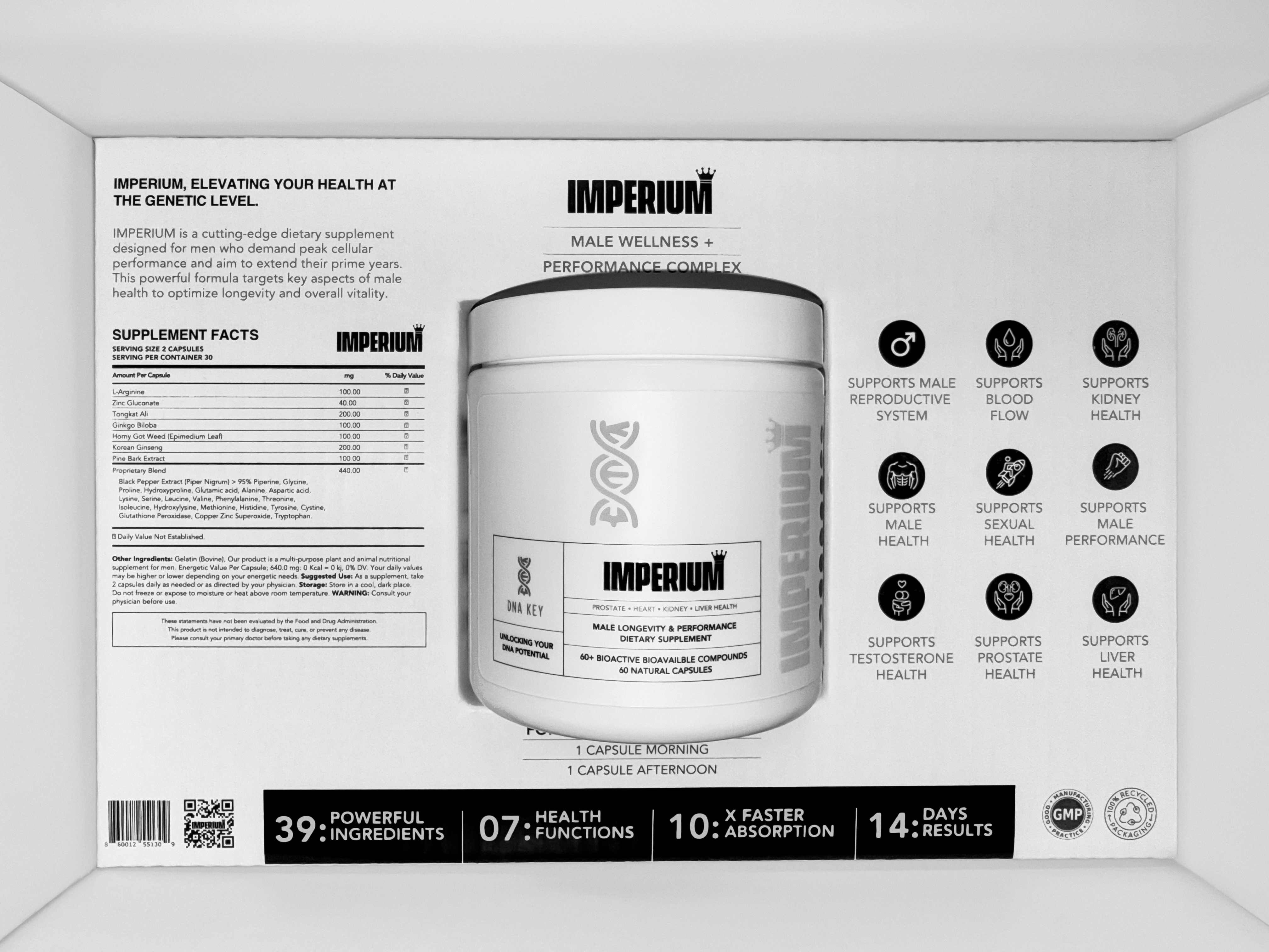 IMPERIUM is a exclusive male dietary supplement designed to support cellular function, energy production, and overall health. Its carefully selected bioactive nutrients-including vitamins, antioxidants, minerals, fatty acids, and free amino acids-are formulated for efficient delivery and absorption. These nutrients help maintain mitochondrial health and promote normal cellular processes, supporting healthy energy metabolism, cellular integrity, and immune function.*